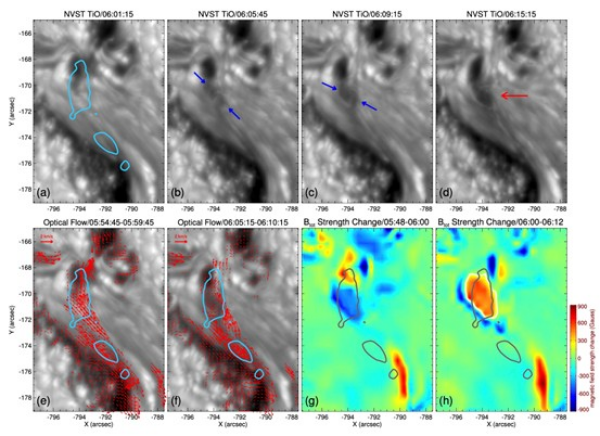 研究人员发现在NVST的TiO波段观测到明显的白光增强,表现为两个白光核及其连接的丝状增亮结构。丝状增亮与黑子半影的纤维结构一致,表明白光辐射中包含来自深层光球的贡献。此外,研究人员在白光耀斑核区域发现了突发的光球涡流运动以及磁场强度骤增的现象。这些迹象表明,耀斑释放的能量可能通过“阿尔芬脉冲波”的形式从日冕快速传递至光球层。