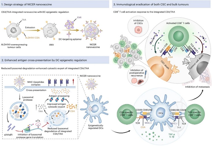 研究构建高效抑制癌症复发转移的表观遗传调控抗原集成化纳米疫苗。恶性肿瘤治疗面临术后复发和转移等问题,肿瘤干细胞因具有自我更新和无限增殖的能力,被学界认为是肿瘤转移和复发主要驱动因素。因此,靶向清除肿瘤干细胞有助于阻断肿瘤复发,但目前缺乏有效的干预策略。