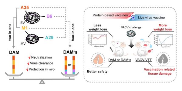 前期,该团队基于结构指导的免疫原理性设计策略,提出了多价嵌合的“多合一”猴痘疫苗设计策略,实现了单一免疫原对猴痘病毒多种感染性病毒粒子的全面保护。为进一步评估抗原组份的选择对多价嵌合疫苗保护效力的影响,该研究基于前期研发二价嵌合疫苗DAM架构,设计了四价嵌合疫苗DAM+。免疫评估数据显示,四价DAM+可激发更广泛的免疫应答,但其中和抗体效价以及对小鼠感染猴痘病毒的保护效力均与二价疫苗DAM相当。同时,在抵抗病毒攻击时,传统活疫苗免疫组小鼠在病毒感染部位出现疫苗接种相关的严重组织损伤,而所有嵌合重组蛋白疫苗均能够通过更为温和的病毒清除过程,实现保护效力与安全性的最佳平衡。