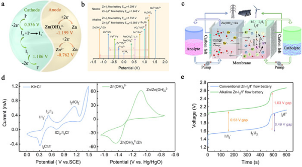 近日,中国科学院金属研究所研究员唐奡、李瑛在高性能锌碘液流电池研究方面取得进展。研究团队创新性提出锌负极碱性电解液环境与碘正极多电子转移路径协同优化策略,通过构建Zn(OH)42−/Zn负极与I−/I2/I+正极,成功研制出开路电压达2.385 V的锌碘液流电池。相关研究成果以A high-voltage alkaline zinc-iodine flow battery enabled by a dual-functional electrolyte additive strategy为题,发表于《先进功能材料》(Advanced Functional Materials)上。