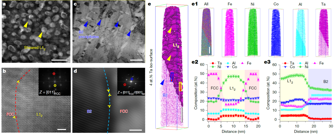图2:(a-d) 具有三相组织的Fe35Ni29Co21Al12Ta3复杂合金室温变形与界面特征,即位错能够切过L12纳米相,并存储于低模量的B2微米相,L12/FCC共格与B2/FCC非共格界面均存在位错;(e)原子探针分析复杂合金的化学成分与分布特征,以及多主元L12纳米相和B2微米相的元素构成。