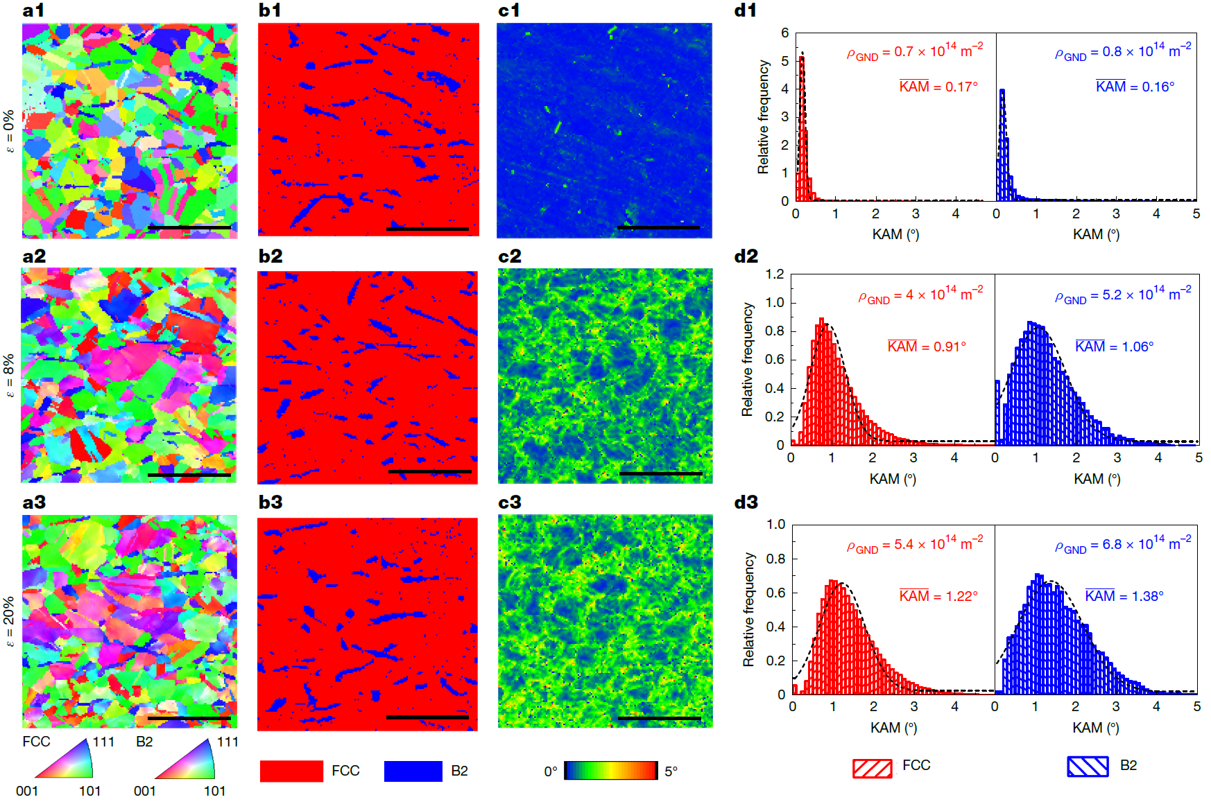 图3:Fe35Ni29Co21Al12Ta3复杂合金中各组成相的位错密度随应变量(a1-d1) ε=0、(a2-d2) ε=8%和(a3-d3) ε=20%的演化,表明低模量B2微米相能够比(FCC+L12)基体存储更高密度的位错。