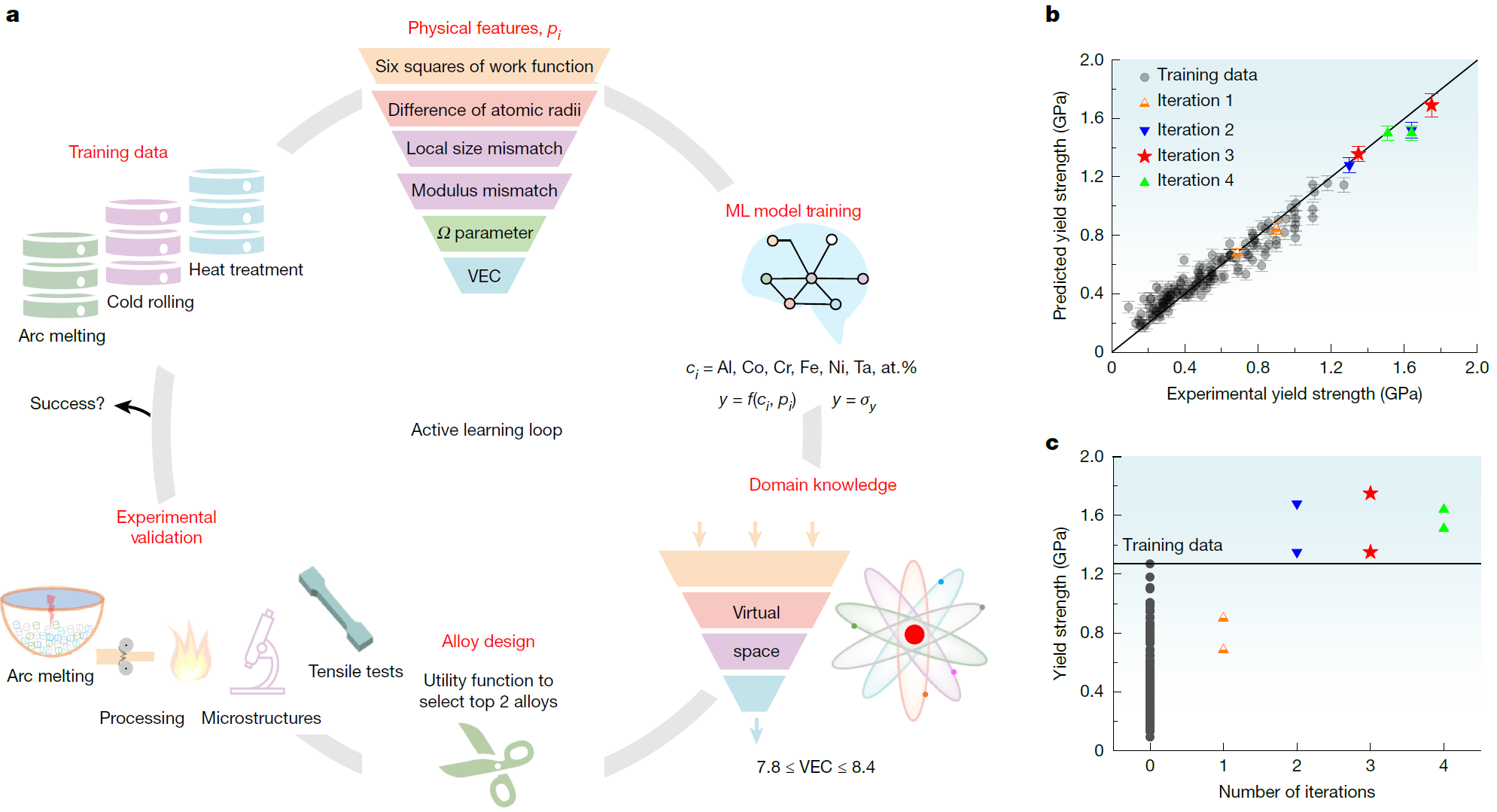 图1:(a)基于领域知识的机器学习模型(主动学习循环由六个步骤组成)预测具有超强塑性的FeNiCoAlTa复杂合金,(b)理论预测屈服强度与实验测量屈服强度相符合,证实了机器学习模型的可靠性,(c)实验测量屈服强度与模型迭代次数的关系,发现了最优成分的Fe35Ni29Co21Al12Ta3复杂合金。