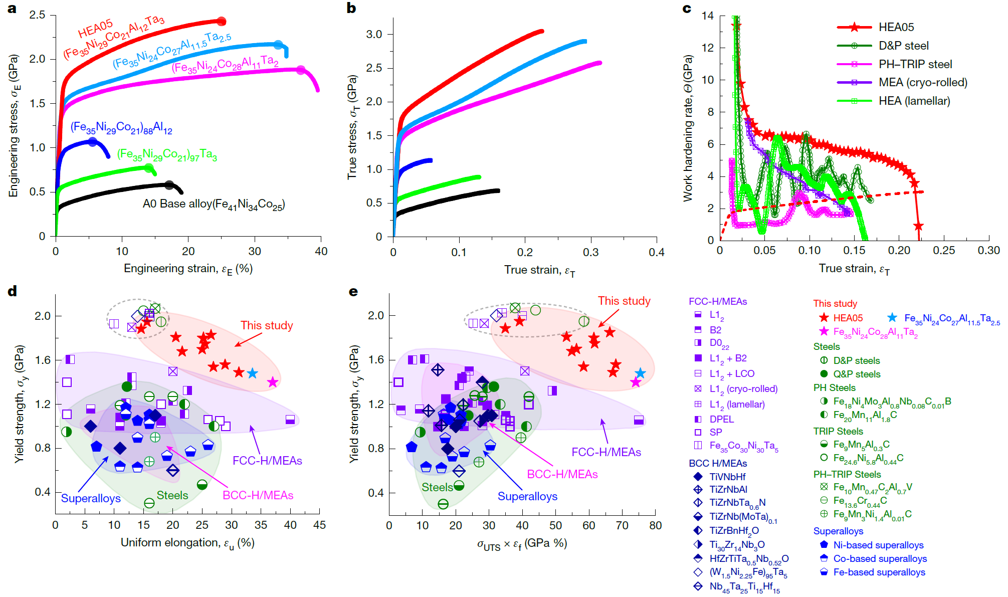 图4:(a-b)不同成分的复杂合金的工程应力-应变和真应力-应变曲线,(c) Fe35Ni29Co21Al12Ta3复杂合金的加工硬化性能与其他2GPa级超高强金属材料(DP钢、马氏体钢、中高熵合金)对比,(d,e) Fe35Ni29Co21Al12Ta3复杂合金的屈服强度-均匀拉伸延伸率匹配和屈服强度-强塑积匹配与其他金属材料对比,室温力学性能组合明显超越目前报道的其他金属材料。
