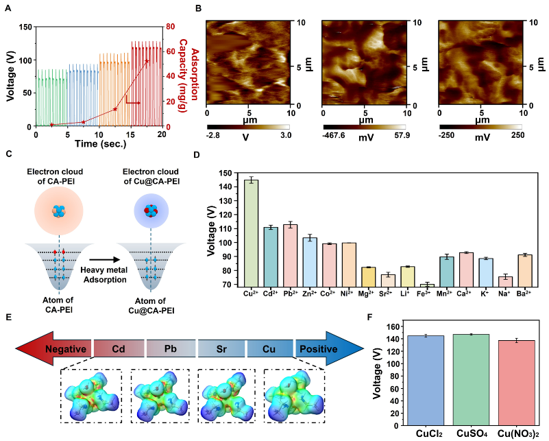 图4展示TEMS的摩擦电性能。Cu2+吸附后,膜输出电压明显高于未吸附膜。KPFM测得膜表面电位从-194 ± 34 mV提升至0.028 ± 0.044 mV,与电压提升趋势吻合。推测吸附重金属后膜电子数减少。比较不同阳离子(均为Cl-配离子)时,TEMS对Cu2+的开路电压(Voc)最高,显示其高灵敏度。此现象主要源于吸附膜对Cu2+的选择性吸附及金属离子间电负性差异。密度泛函理论(DFT)计算的PEI络合物静电位图显示,不同金属离子吸附导致输出电压不同。