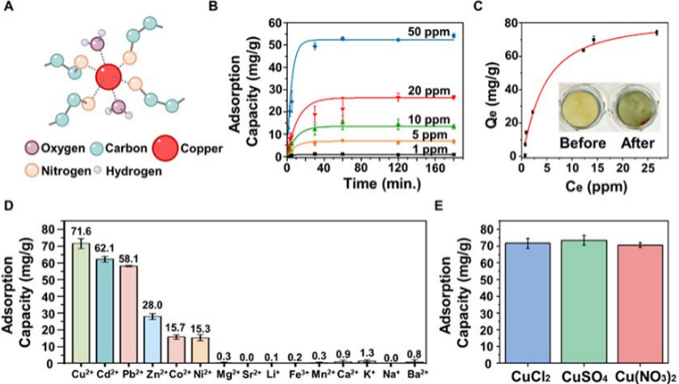图3可见,膜的吸附速率在初期快速提升,30分钟内达平衡。初期活性位点丰富,使金属离子易被吸附,随着Cu2+占据位点,吸附速率逐渐放缓。随初始金属浓度增加,吸附容量也随之上升。动力学分析结果显示吸附符合拟一级模型,说明吸附速率受溶液中Cu2+浓度影响。吸附符合Langmuir等温模型,拟合结果R2达0.99。在不同阳离子(Cu2+、Cd2+、Pb2+等)与固定阴离子Cl-的条件下测试,结果显示吸附膜对Cu2+展现最高吸附能力,显示其吸附选择性。此外,改变阴离子种类(Cl-、SO42-、NO3-)对Cu2+吸附影响甚微,说明阴离子种类对吸附行为无显著影响。