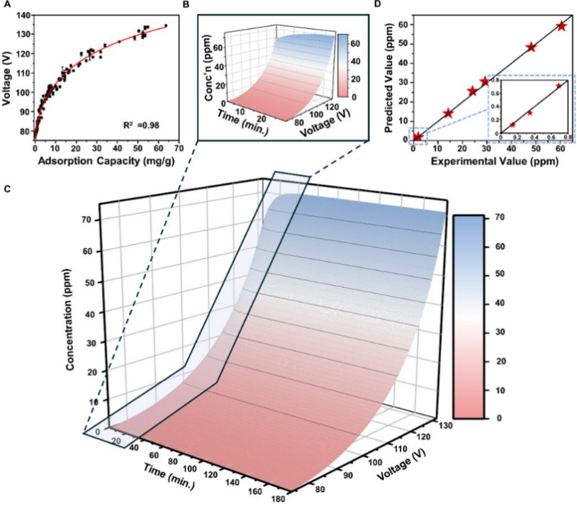图5中表明吸附容量与Voc间明显相关。结合吸附动力学、等温模型及质量平衡,可推导出初始浓度与摩擦电压函数关系,并以三维图展示。吸附初30分钟内,时间与电压均显著影响对初始浓度的计算;30分钟后电压为计算初始浓度的主要影响因素,符合吸附动力学观察。透过与未知浓度Cu2+溶液的ICP-OES测试比对,预测初始浓度与实测高度相关(Pearson相关係数0.999),误差平均仅5.14%。此方法具有高灵敏度与可靠性,不仅可监测吸附量,判定膜再生时机,更能推算水中金属初浓度,提升污染侦测准确性。