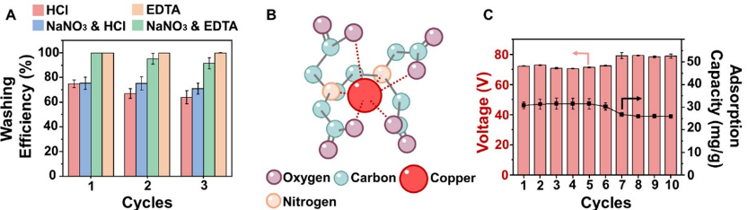 图1示意了人工超积累植物系统的核心设计理念,整合了吸附、检测及再生三大功能。系统设计分三步骤:首先,开发具有高效金属捕捉能力的吸附膜,并系统评估其吸附性能;其次,将吸附膜与摩擦电感测器结合,构建出能对多种重金属离子进行高灵敏检测的TEMS系统。此系统进一步结合动力学模型、吸附等温线及质量平衡分析,实现对金属离子的特异性辨识及初始浓度准确预测;最后,透过脱附-再吸附循环实验,验证TEMS在吸附与感测功能上的可重复使用性,确保系统整合流程的循环操作与可持续应用。
