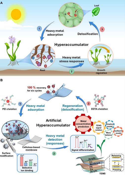 水中重金属污染对环境与人类健康构成严重威胁,然而现有的治理技术普遍面临结构复杂、成本高昂及效率不彰等问题。自然界中,超积累植物(hyperaccumulators)能有效从土壤或水体中吸收大量重金属,并经由反应与解毒机制将其累积于体内,同时维持生命功能稳定。受到这类植物的启发,研究组开发出一种可再生的人工超积累植物系统,结合纤维素基吸附膜与摩擦电膜感测技术(triboelectric membrane sensor, TEMS),实现对重金属的高效捕捉、灵敏侦测与污染程度的精准预测。