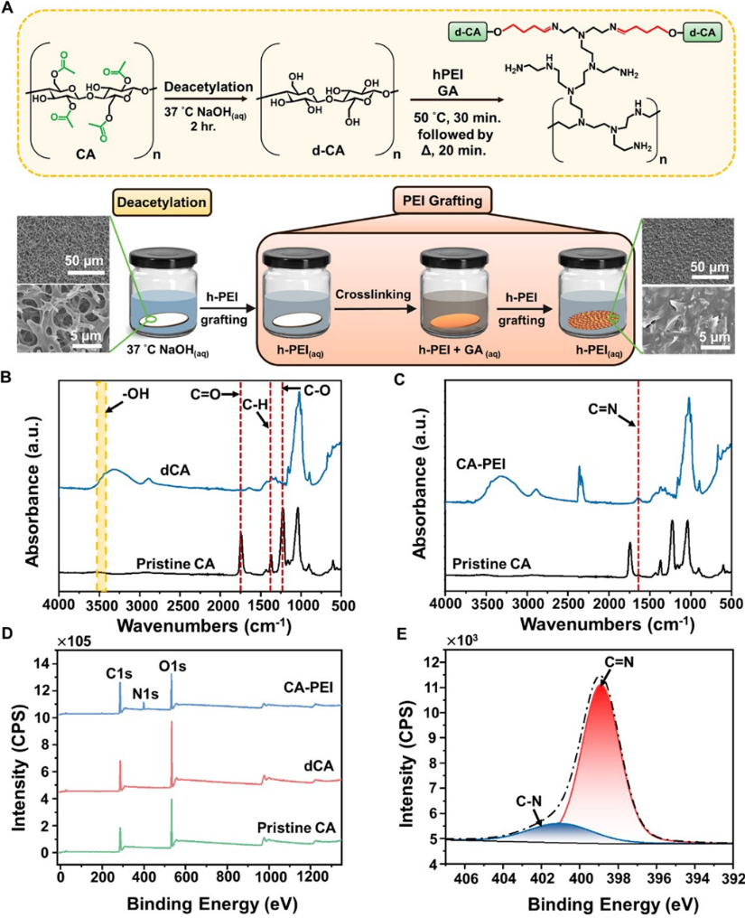 如图2所示,在吸附膜制作中,先对醋酸纤维素(CA)膜进行去乙酰化处理,将膜表面乙酰基转换为羟基,利于后续超支化聚乙烯亚胺(hPEI)接枝反应。去乙酰化膜(dCA)浸泡于hPEI溶液中,并以戊二醛作为交联剂,在50°C水浴中进行希夫碱反应(Schiff base reaction)。产品由SEM、EDS、FTIR及XPS表征,确认接枝反应成功。