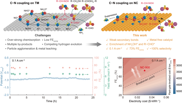 研究人员利用密度泛函理论计算,评估了N掺杂类型对NH2OH*生成的影响,筛选出最有利于NH2OH*生成的石墨化N–C位点。据此,通过g-C3N4介导法设计合成了具有不同类型N掺杂的NC催化剂。电化学实验表明,石墨化N含量最高的NC-900催化剂具有最高的苯甲醛肟法拉第效率。在流动型反应器中,该催化剂可在0.1 A cm−2的电流密度下稳定运行24小时,苯甲醛肟的平均法拉第效率达到73±1%,转化速率为6.8±0.1 mol h−1 m−2。技术-经济性分析表明,有关参数实现了苯甲醛肟电合成的经济可行性。
