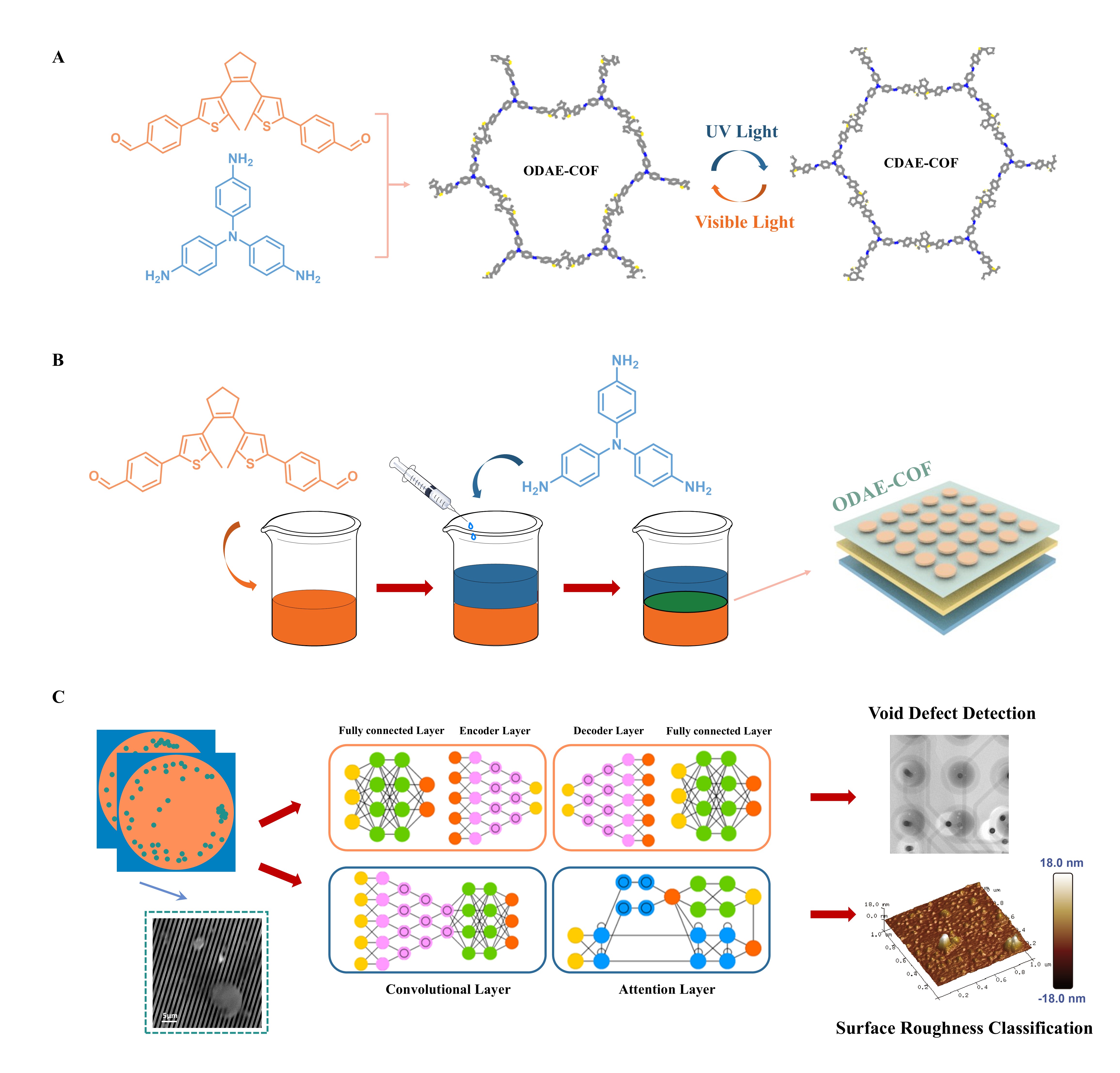 科学家开发用于晶圆表面质量评价的共价有机框架忆阻器。 华东理工大学教授张斌、副教授胡越、教授轩福贞团队,报道了一种大面积刺激响应型共价有机框架薄膜(ODAE-COF),以此为活性层制备了具有光电双响应特性的忆阻器,并开发了基于忆阻器的新型边缘计算系统,实现了对有图案晶圆的缺陷检测和无图案晶圆的表面粗糙度进行分类。相关研究近日发表于《物质》。