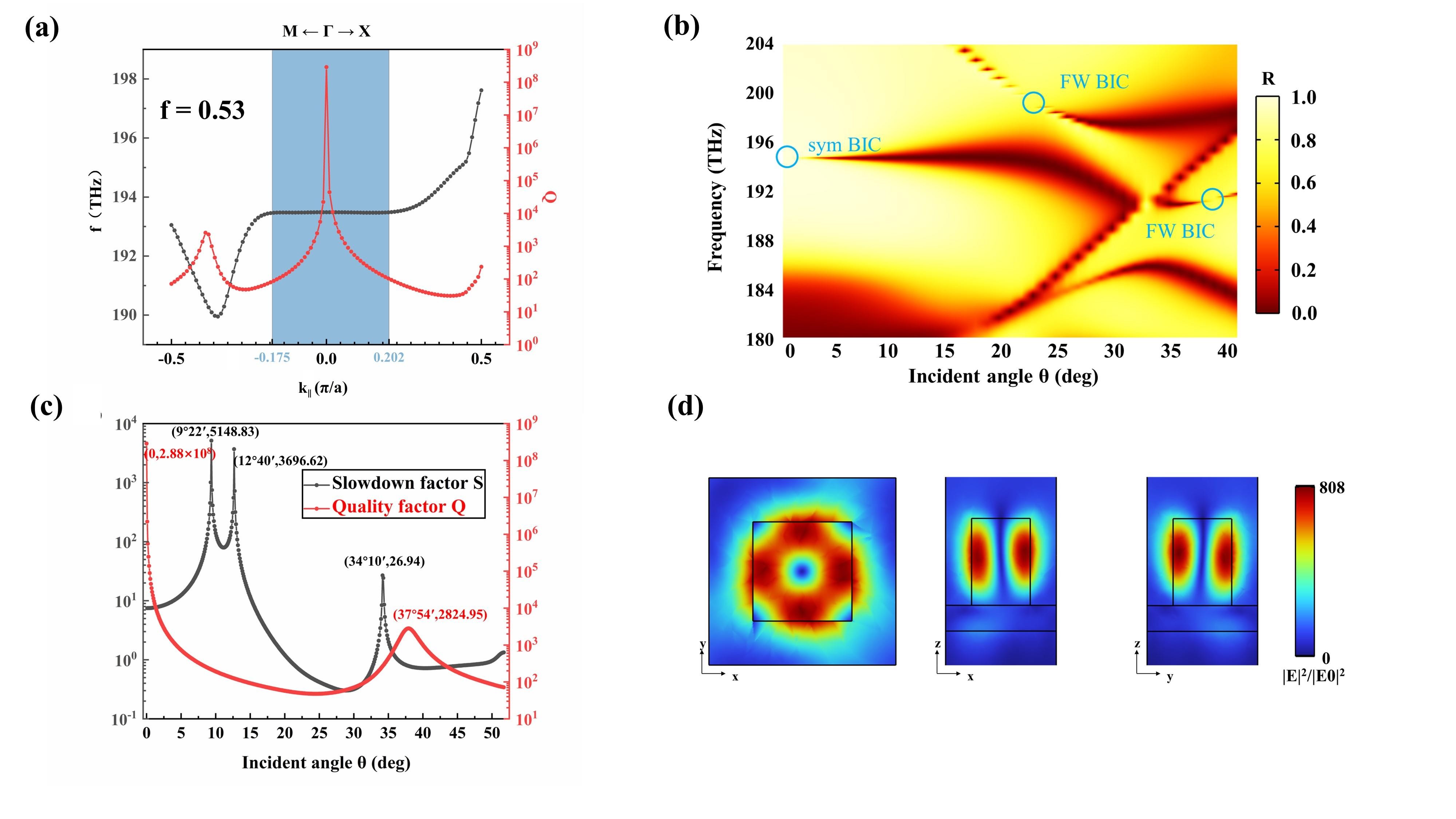 (a)f=0.53时,混合磁偶极模式的色散关系和Q因子(b)归一化反射谱(c)减速因子S和品质因子Q随入射角θ的的变化关系(d)入射角θ为9°22′时,电场及归一化强度增强。西安光机所供图