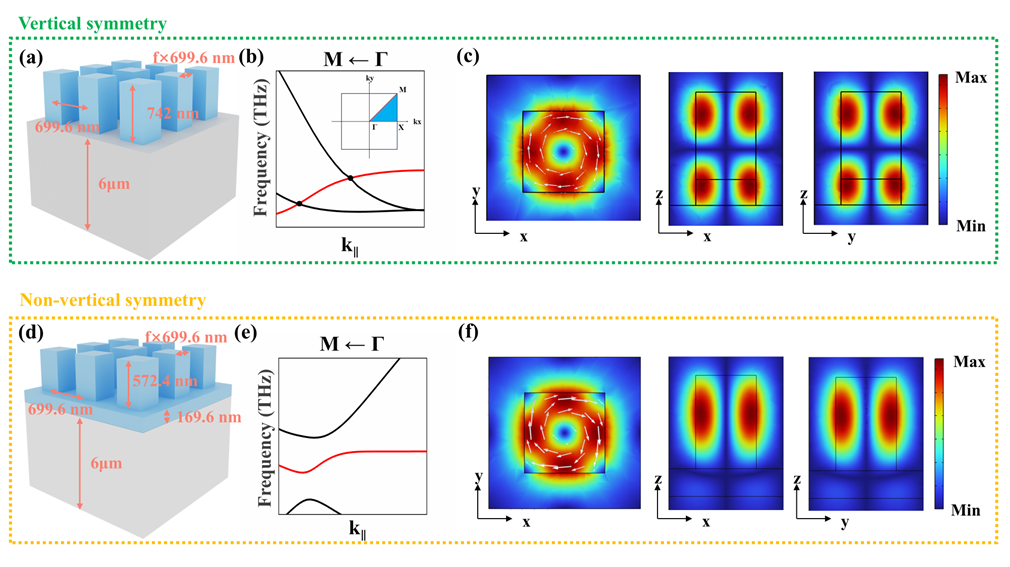 (a)(d)垂直对称和非垂直对称超表面的示意图(b)(e)色散关系(c)(f)正入射时,第一激发磁偶极模式和混合磁偶极模式的归一化电场分布。西安光机所供图