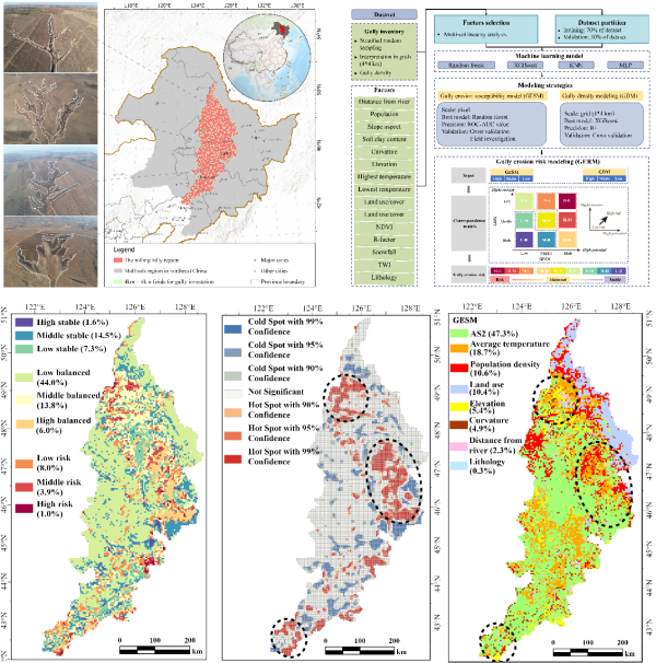 漫川漫岗黑土区侵蚀沟未来发育风险模拟及影响因素空间定量评价研究获进展。漫川漫岗黑土区是我国重要粮食产区。目前,该区域沟道侵蚀剧烈,侵蚀沟总数约占东北黑土区侵蚀沟总数的1/5,严重危害农业生产和生态环境。同时,该区域耕地中高达90%的侵蚀沟处于活跃发展阶段,未来继续蚕食耕地的风险较高。因此,明确该区域侵蚀沟发育风险及其控制因素有助于沟蚀防控。然而,现有研究通常采用沟蚀敏感性模型来评估沟道形成概率,未考虑侵蚀沟进一步发育风险。