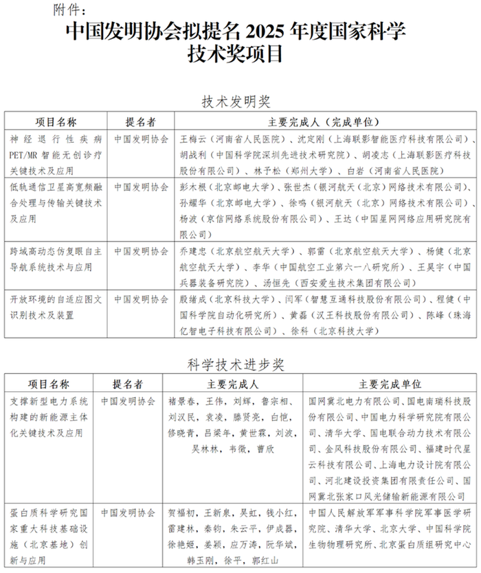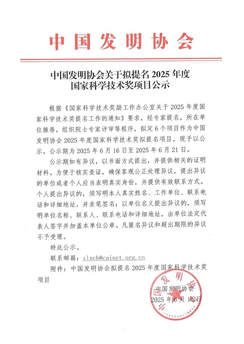 中国发明协会关于拟提名2025年度国家科学技术奖项目公示