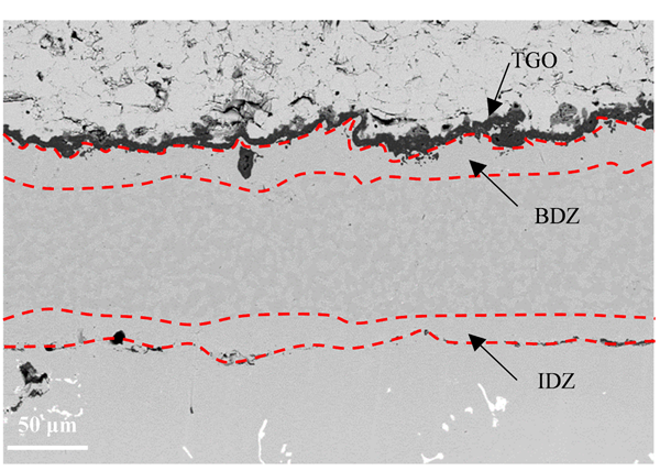 基于损伤表征的热障涂层寿命预测模型建立。热障涂层是先进航空发动机及燃气轮机高温部件的关键防护系统,其直面高温燃气的冲刷,发挥降低金属构件表面温度的作用。有研究表明,由于热障涂层的应用,发动机初温可提高100℃以上。热障涂层-基体系统由于热不匹配和热生长氧化层生长应力的作用导致涂层提前失效,使得涡轮叶片服役寿命缩短。因此,有必要对热障涂层的高温退化行为开展多因素影响规律研究,建立综合考虑几何特征与材料退化的寿命预测模型。