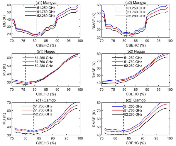 降水条件下,51-52 GHz通道亮温模拟的平均误差(MB)和均方根误差(RMSE)随CBEHC变化的特征