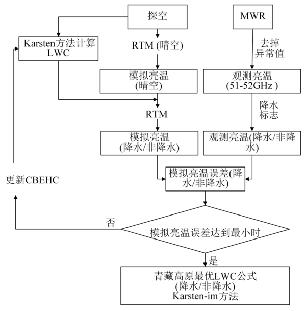 云对地气系统的辐射收支及水循环影响显著,是大气模型中最不确定的因素之一。青藏高原作为亚洲水塔,对云液态水含量较准确的原位测量几乎没有,使得科学家对其上云液态水含量分布认识不清。因此,为了衡量数值模式中描述青藏高原云-辐射-降水特征的准确性,需要开发观测高原云水含量的观测仪器和反演算法。云水含量的飞机观测费时费力,雷达观测需要假设粒子谱分布,卫星反演时存在较多的假设,而地基微波辐射计能够在大部分天气条件下提供高时间分辨率的大气观测信息,其中51-52 GHz观测亮温对大气液态水信息敏感,因此,研究团队提出了利用地基微波辐射计51-52 GHz观测亮温估算高原云液态水含量的新方法。