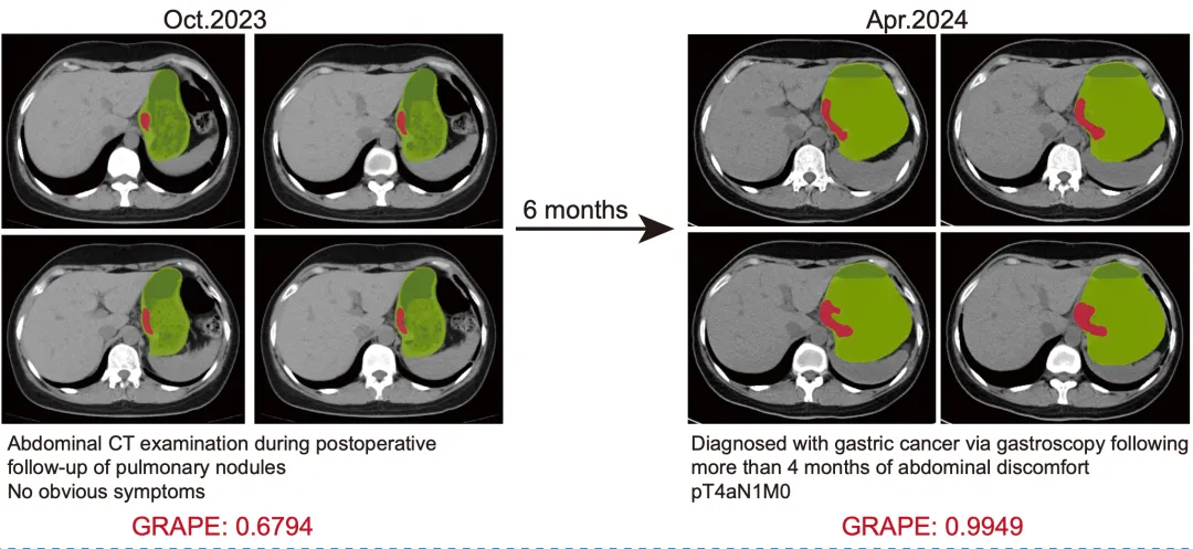 论文第一作者、浙江省肿瘤医院胃外科博士胡灿向《中国科学报》介绍了本次研究中的一个案例。团队对11名患者确诊胃癌前的CT影像进行回顾性分析,发现AI模型可提前2~10个月发现胃癌。