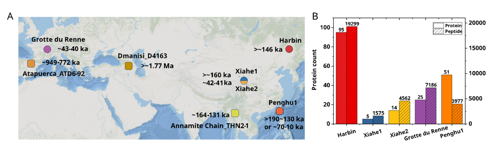 联合研究团队通过自主建立的古蛋白质组实验系统从哈尔滨古人类化石中获取到大量质谱数据,鉴定到308,458个谱图与20,455个肽段,通过降解相关修饰的分析确认了95种内源性蛋白质;这代表着目前已知最高质量的古人类蛋白质组数据,肽段数比此前基于同时期化石产生的数据多了11倍(图1)。该团队还首创了古蛋白全自动化鉴定人群分类的方法体系,发现122个在人科物种中特有的氨基酸突变位点。其中,102个黑猩猩、大猩猩和猩猩中的位点为衍生型,而哈尔滨古人类个体表现为100%匹配的祖先型;15个位点为人属衍生型,哈尔滨古人类个体表现为100%匹配的衍生型。因而,团队将哈尔滨古人类个体归入人属。同时,该研究团队发现4个丹尼索瓦人群特有的突变位点,包括1个祖先型位点和3个衍生型位点,3个衍生型位点匹配率高达86.57%(1个质量高,2个质量略低)。系统发育分析表明,该哈尔滨古人类个体与发现于丹尼索瓦洞穴的Denisova 3号个体构成单系类群(支持率98%-100%)。相关研究证实了其为丹尼索瓦相关人群,实现了完整头骨形态与分子证据的直接关联。