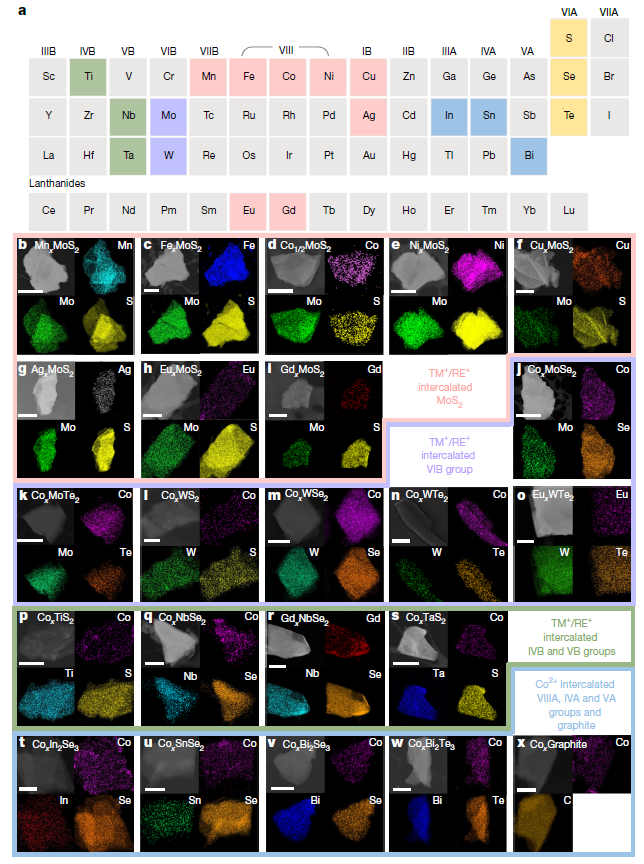 尽管已有少数关于化学或电化学插层的研究案例,但整体仍受局限。研究组提出了一种通用的插层-阳离子交换策略,成功在多种2DACs中构建出高度有序的磁性插层超晶格(MISLs),并实现可调的磁性结构。插层离子涵盖了Cu+、Ag+等一价过渡金属离子,Mn2+、Fe2+、Co2+、Ni2+等二价磁性离子,以及Eu3+、Gd3+等三价稀土离子。所用的二维宿主材料包括VIB族(如MoS2、MoSe2、MoTe2、WS2、WSe2、WTe2),以及IVB、VB、IIIA、IVA和VA族材料(如TiS2、NbS2、NbSe2、TaS2、In2Se3、SnSe2、Bi2Se3和Bi2Te3)。