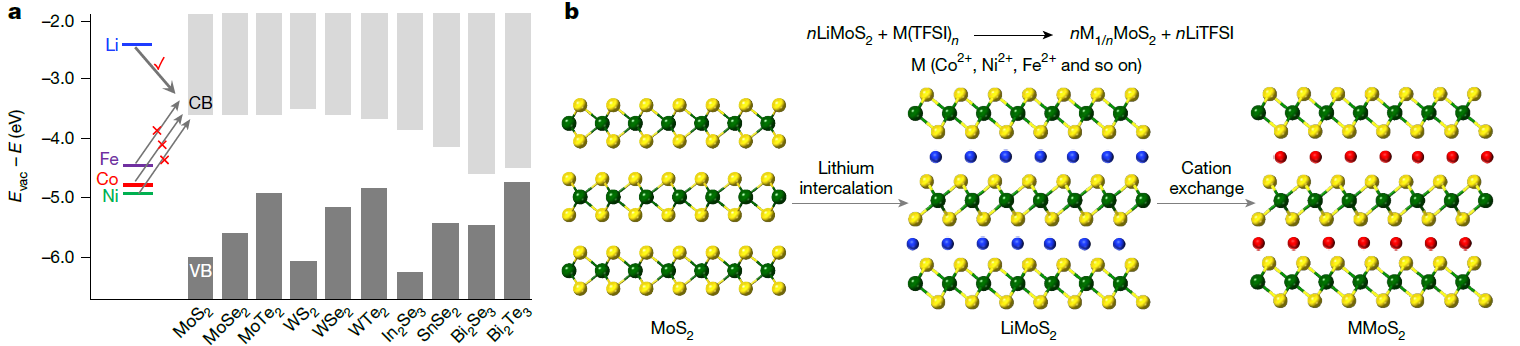 图1:锂插层和阳离子交换以实现磁性插层超晶格材料库的流程图。