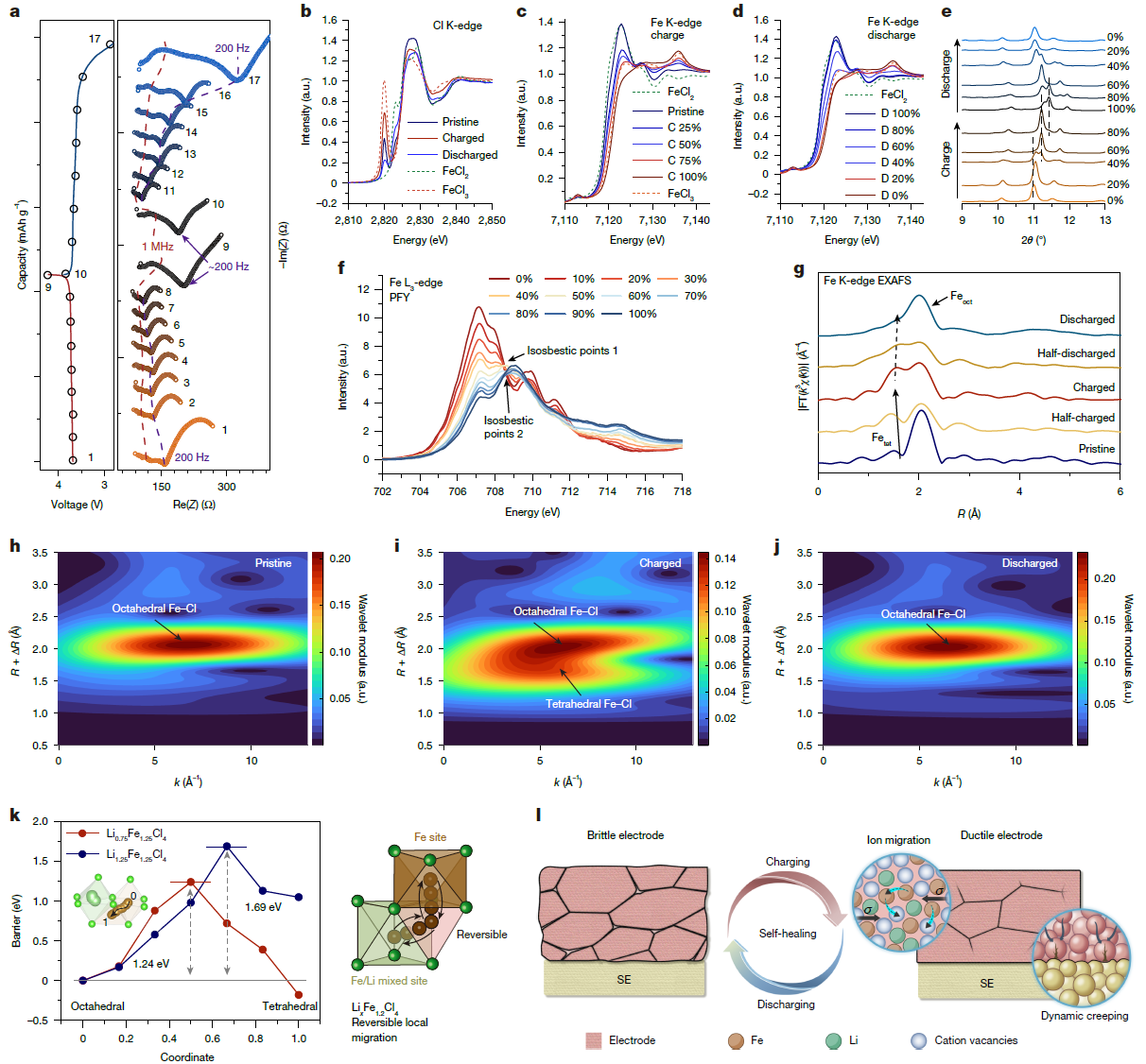 卤化物一体化正极推动高性能全固态电池应用。 近日,宁波东方理工大学/浙江省全省全固态动力电池技术与应用重点实验室的孙学良院士团队与加拿大西安大略大学T.-K. Sham教授、美国马里兰大学莫一非教授合作,在全固态电池正极设计领域取得了突破性进展。2025年6月25日,相关研究成果以A cost-effective all-in-one halide material for all-solid-state batteries为题,发表在Nature期刊上。该成果报道了一种低成本铁基卤化物材料,将正极活性材料、电解质和导电剂的功能集于一身,并展现出电极层面的自修复能力。这项工作解决了全固态电池在能量密度、循环寿命和成本方面的关键瓶颈。该成果的共同第一作者为西安大略大学博士后傅佳敏、宁波东方理工大学王长虹助理教授和汪硕助理教授。