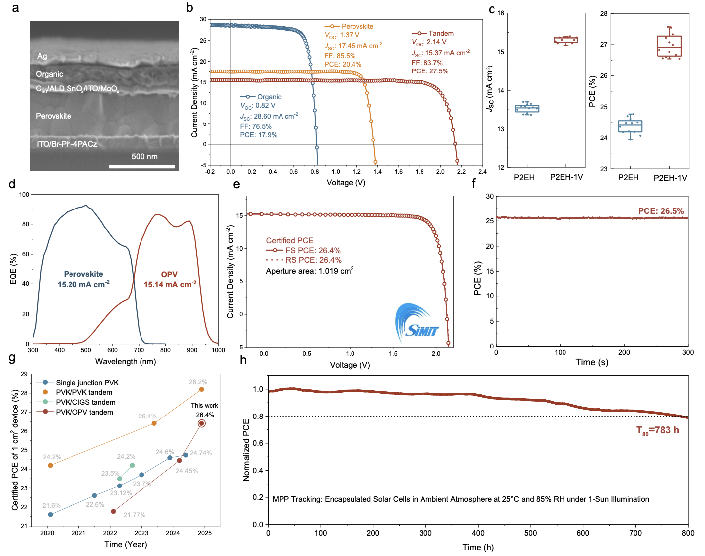在此基础上,侯毅团队博士后贾镇榕与博士生郭虓合作,将高效有机底电池与高性能钙钛矿顶电池结合,通过透明导电氧化物中间连接层构建了全薄膜叠层结构。最终,该钙钛矿–有机叠层太阳能电池在0.05 cm2面积下实现了27.5%的效率,1 cm2面积下达到26.7%(第三方认证效率26.4%),刷新了钙钛矿–有机叠层、钙钛矿–CIGS叠层及单结钙钛矿太阳能电池相同面积下的世界纪录。目前,侯毅教授团队在新加坡实验室持续攻关,钙钛矿–有机技术已具备突破30%器件效率的潜力。该研究还得到了杜晓艳教授、郝晓涛教授及尹新星教授团队的大力支持。