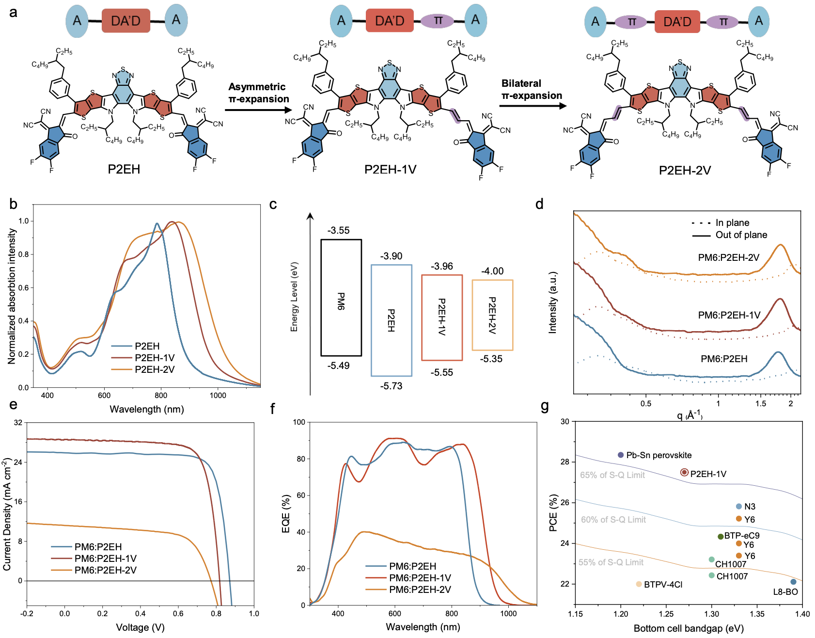 27.5%效率纪录!钙钛矿–有机全薄膜叠层太阳能电池领域新突破。 2025年6月25日,新加坡国立大学校长青年教授、Singfilm创始人侯毅教授团队在Nature期刊在线发表题为Efficient near-infrared harvesting in perovskite–organic tandem solar cells的最新成果。他们设计并合成了新型窄带隙非富勒烯受体P2EH-1V,基于此制备的钙钛矿–有机叠层太阳能电池在0.05 cm2面积下实现了27.5%的效率,1 cm2面积下达到26.7%(第三方认证效率26.4%),刷新了钙钛矿–有机叠层、钙钛矿–CIGS叠层及单结钙钛矿太阳能电池相同面积下的世界纪录。