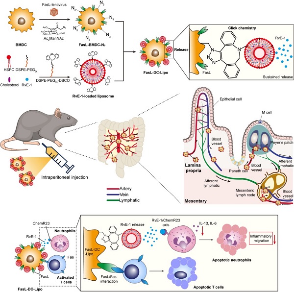 该研究基于对IBD患者病灶样本的蛋白质组学分析,确定了IBD组织具有T细胞高浸润和Fas高表达等关键分子特征。针对上述分子特征,通过基因工程技术制备了过表达Fas配体(FasL)的DCs,并通过生物正交化学偶联封装消退素E1(RvE-1)的脂质体,获得工程化DCs。结果显示:经腹腔注射后,通过血管途径由肠系膜定向迁移并浸润肠道组织,提高了RvE-1的肠道靶向分布;通过Fas/FasL信号和释放的RvE-1引发Fas+CD8+ T细胞和中性粒细胞的凋亡,从而抑制了肠道炎症反应;肠炎部位免疫细胞重编程为抗炎表型,抗炎细胞因子含量升高,显著抑制了小鼠和兔模型中IBD的进展。人源化生物杂合DC系统的构建及初步概念验证发现,其有良好的临床转化潜力,有望为动态调节肠道疾病进展中的免疫稳态提供安全可行的个性化治疗平台。