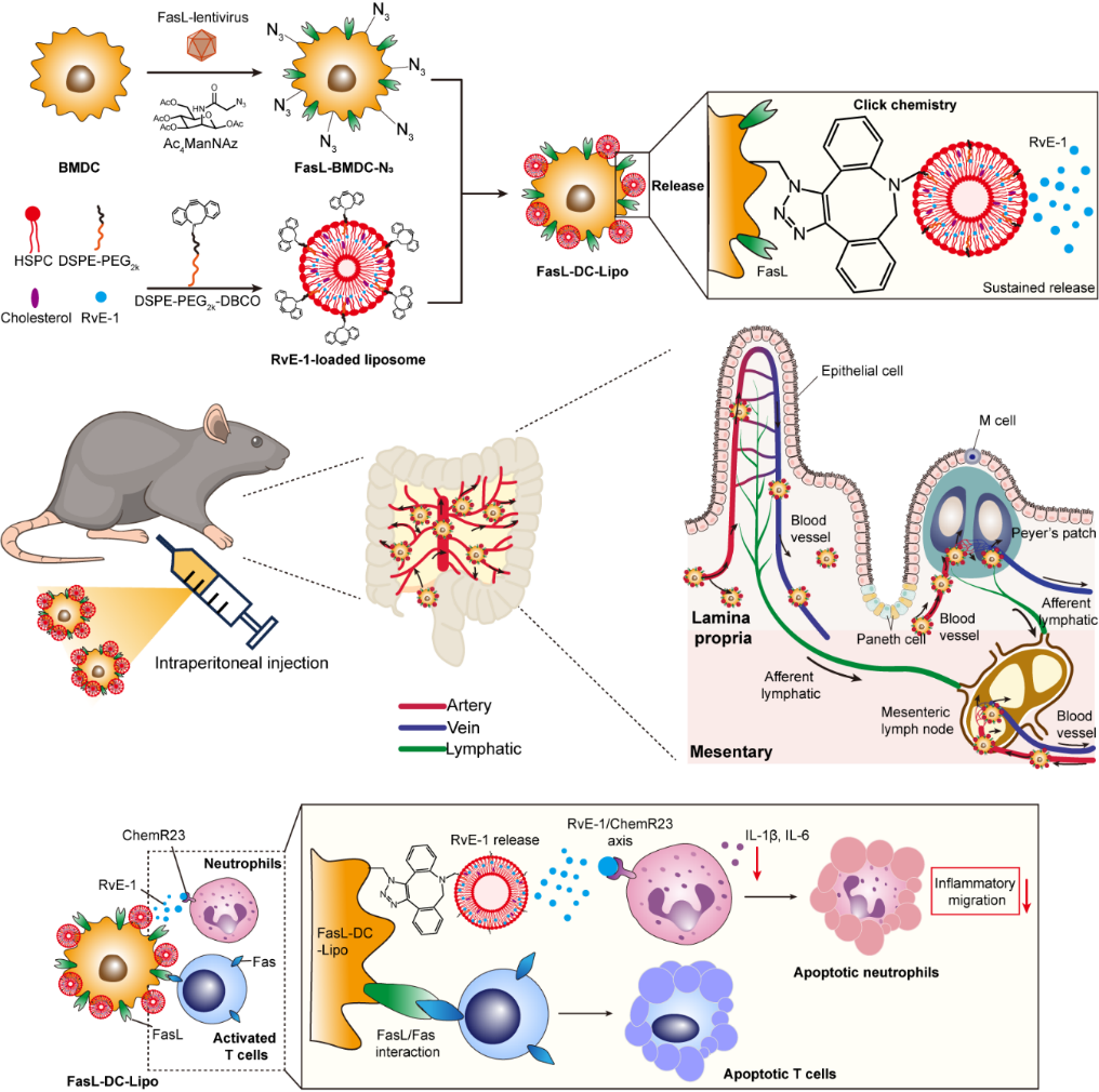 基于IBD患者病灶的分子特征,研究团队构建了工程化树突状细胞(DCs)递药系统。机制研究表明,经腹腔注射后,该递药系统可通过血管途径,由肠系膜定向迁移并浸润肠道组织,提高消退素E1(RvE-1)的肠道靶向分布,有效诱导中性粒细胞和活化T细胞的凋亡,减少IBD病灶促炎症免疫细胞比例,在小鼠和兔IBD模型中,DCs递药系统均表现出良好的治疗效果。
