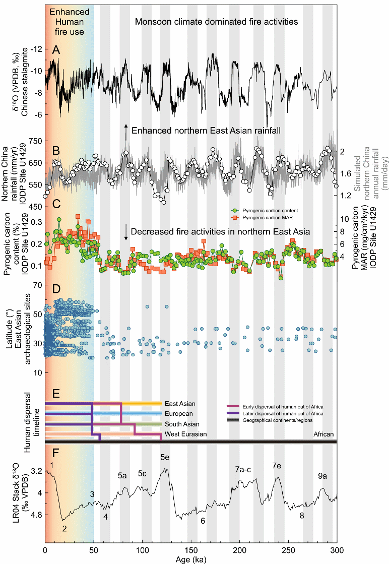 研究结果显示,在30万至5万年前这一时段内,东亚季风气候是主导古火演化的关键因素,冷干气候时期火活动更强,暖湿期则较弱。然而,自5万年前至今,火强度出现了大幅升高的现象,呈现出与季风气候脱耦的趋势。这一变化正好对应了东亚地区人口的急剧扩张时期,表明人类大规模用火所产生的显著影响。研究进一步对全球其他区域的古火证据进行了综合对比,发现5万年前在欧洲、东南亚以及巴布亚新几内亚-澳大利亚等地区,均出现了火强度急剧升高的现象。研究认为,5万年前的冰期,现代人类开启了第二次走出非洲的迁徙历程。冰期海平面下降,印太暖池区大面积的陆架出露为陆地,雨林屏障作用减弱,使得人类在不到一万年的时间里就迅速扩散至东亚、东南亚乃至澳大利亚。人口的急剧扩张极大地促进了用火频率的上升。此外,冰期气候寒冷,食物资源相对匮乏,人类对用火的需求也随之大幅增加。这些因素最终共同促成了5万年前成为人类开始大规模用火的关键时间节点。这也进一步表明,人类可能在末次冰期就已经通过用火在全球碳循环演变中留下了深刻印记。