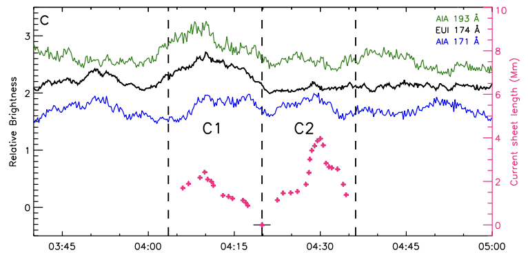 研究人员利用Solar Orbiter探测器2023年4月10日在距离太阳0.293AU处获取的极紫外成像数据,在太阳宁静区一个日冕亮点中识别出电流片演化过程的两个阶段——第一阶段,电流片C1沿某一方向发展,约10分钟内伸展至2.4Mm,后收缩至磁零点;第二阶段,约3分钟后,与C1垂直方向的C2电流片形成并延伸至4Mm,后逐渐消失。研究发现,两个阶段重联过程均伴随明显的等离子体流动和温度升高。同时,日冕亮点亮度与C1/C2长度变化高度一致,呈现约20分钟的衰减振荡,这表明磁能在周期性地向热能和动能转化,符合振荡磁重联典型表现。进一步,研究指出,持续的振荡重联或扮演“磁内燃机”角色,即通过不间断、节律性的磁能释放,在维持整体磁拓扑稳定的前提下,为亮点或其他小尺度结构持续供能并实现准周期性加热。