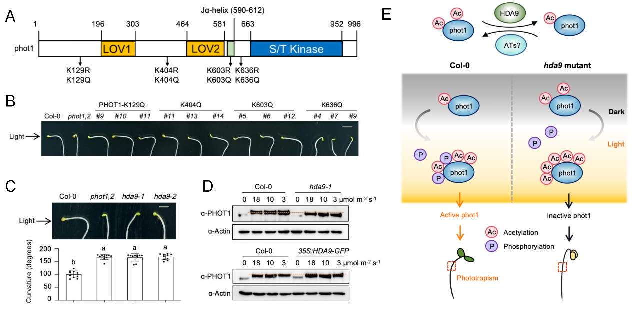 研究人员鉴定发现phot1上多个保守的赖氨酸位点发生乙酰化修饰,并证实第636赖氨酸位点的乙酰化修饰调控phot1的自磷酸化与激酶活性,影响植物的向光性反应;遗传表型筛选发现赖氨酸去乙酰化酶HDA9为调控植物向光性和phot1活性的关键上游因子;生化分析证实HDA9去乙酰化phot1促进其磷酸化,而照光后phot1与HDA9互作减弱,phot1乙酰化增加抑制其磷酸化激活;最后,研究证实该"乙酰化-磷酸化协同调控"作用在不同物种如番茄、烟草和花生中具有高度的保守性,凸显该机制在植物向光性信号转导途径中的广泛性与重要性。