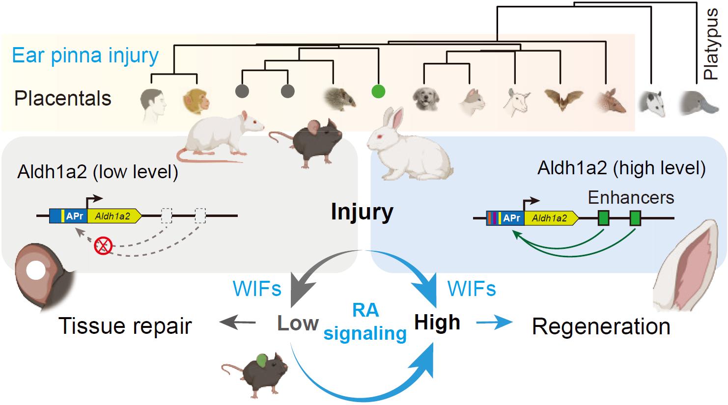 中国科学家找到参与哺乳动物再生的首个分子开关。 再生能力演化模型。图解:在小鼠和大鼠中,Aldh1a2基因关联的增强子活性的丢失导致视黄酸限速合成酶在损伤后表达不足,进而引起视黄酸信号通路活性较低、无法诱导WIFs进行形态发生产生新的组织。激活RA信号通路让小鼠及大鼠重新获得再生能力。王伟 供图