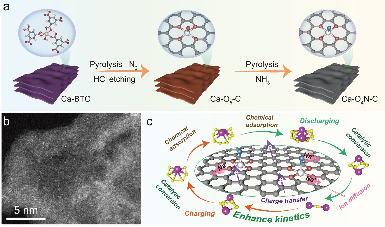 研究提出制备高效钠硫电池新方法。近日,中国科学院合肥物质科学研究院强磁场科学中心研究员王辉和郑方才,在钠硫电池主族金属催化剂性能研究方面取得进展。该研究提出了轴向N配体调控钙(Ca)单原子位点电荷局域化策略,提升了钠硫电池的反应性能。