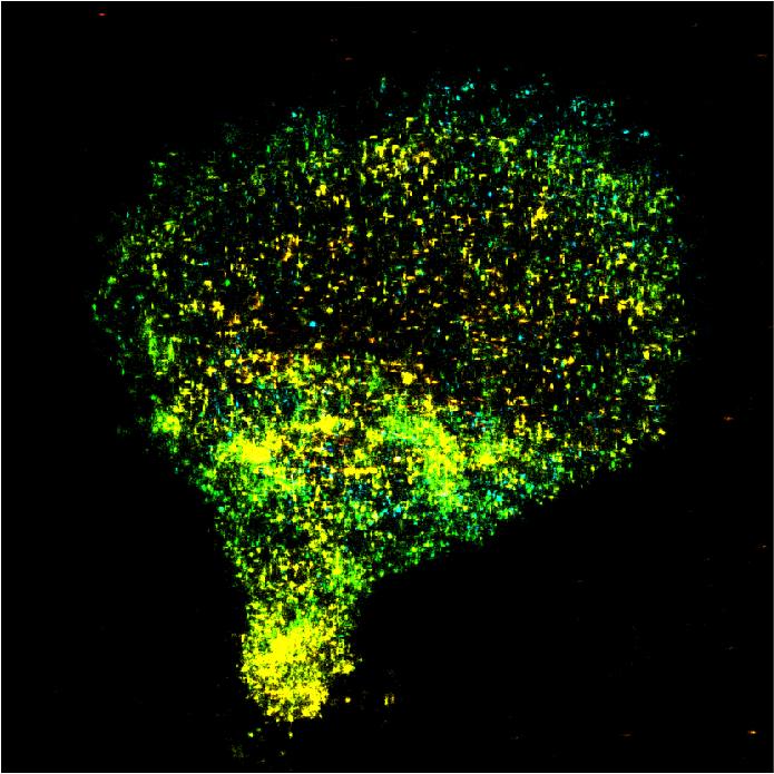 单个树突状细胞超分辨成像,其在环磷酸鸟苷作用下奋力变形移动,每一个亮点代表着增强的肌球蛋白活性