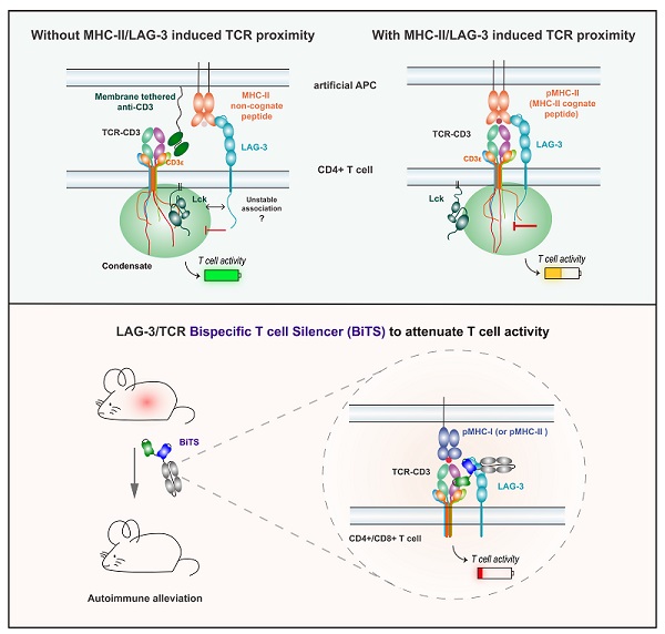 LAG-3可通过与TCR/CD3复合物的CD3e子链发生相分离而实现其抑制功能,利用LAG-3/TCR双特异性抗体增强LAG-3与TCR的顺式邻近有助于自身免疫疾病治疗。
