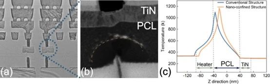 (a)纳米限制结构存储单元的透射电子显微镜截面图、(b)单个存储单元的透射电子显微镜截面图、(c)相变存储单元有限元模拟的温度分布结果