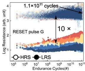 研究人员对纳米限制结构的相变存储单元开展了大规模的循环擦写实验。结果表明,该结构在较低能量的电学脉冲下依然保持一个数量级以上的电阻差异,实现了超过1.0×1011次的可靠擦写寿命。