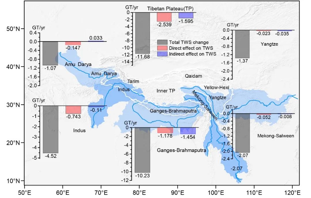 南亚黑碳通过直接消融效应与间接补给效应对青藏高原重点流域陆表水储量(GT/yr)变化的影响。西北院供图。