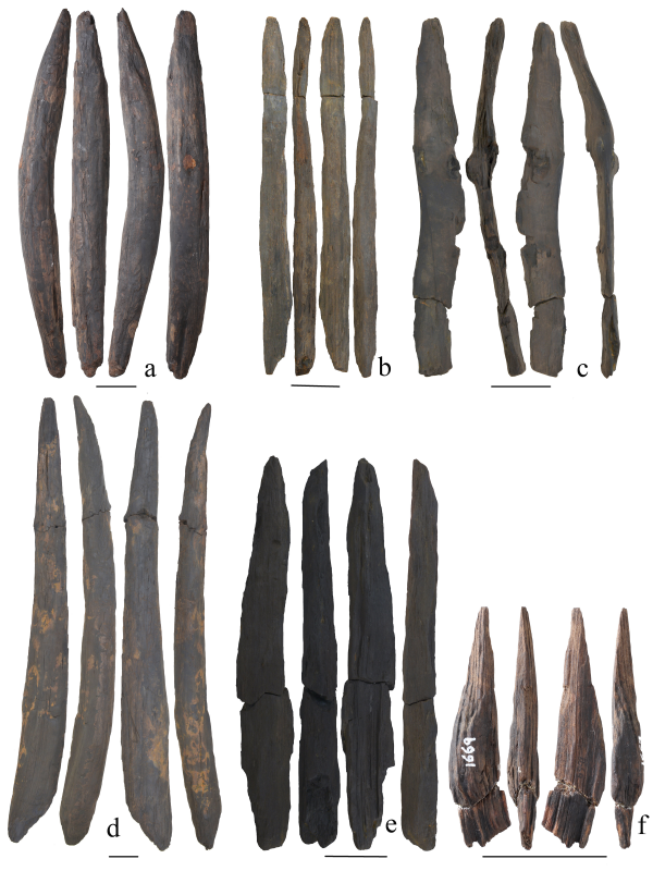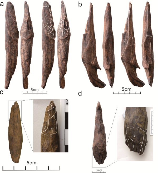 为论证这些木器的人工属性和功能,科研团队开展了材质分析、痕迹分析、残留物分析和实验模拟等专项研究。研究发现,木器主要使用松木制作。宏观和显微观察发现,一些标本存在因砍枝修形削尖而留下的削刮痕,尖端存在因使用而产生的磨光条痕和断裂破损。这些痕迹出现在特定部位并具有方向性,是人类加工与使用的证据。一些木器尖端保留土壤残留物如植物淀粉粒,证明木器的主要功能是挖掘地下植物食材。实验模拟复原了用石器加工木器并用来挖掘植物根茎的过程,辅证了遗址出土的木器是人类制作和使用的工具的论点。