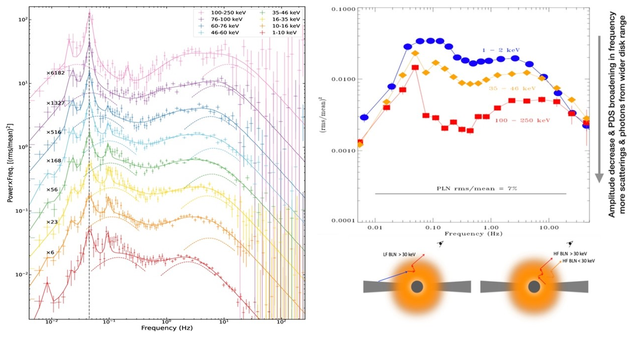 左图:黑洞双星MAXI J1820+070的慧眼卫星单次观测随光子能量变化的傅里叶功率谱。 右图:带限噪声平台与光子能量和吸积与逆康普顿散射的物理图像。