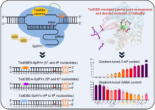 该研究在国家自然科学基金等项目的资助下,开发出编辑窗口高度浓缩(≤3个核苷酸)的植物精准双碱基编辑器TadDBE,并利用TadDBE对水稻香味性状基因OsBadh2进行定向进化与原位修饰,首次获得了2-AP(2-乙酰基-1-吡咯啉,水稻主要香味物质)和γ-氨基丁酸(GABA,对人体健康有多种益处)含量梯度变化的系列水稻新种质。