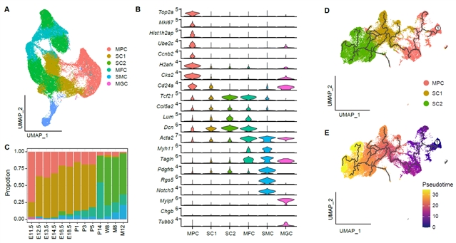 在对单细胞数据经过批次校正后,研究人员将高质量的单细胞数据整合到一个统一的数据集中,使用均匀流形近似和投影(UMAP)对所有细胞进行了聚类,并根据标记基因的表达获得了7种主要细胞类型和31个细胞簇。为了深入了解卵巢间充质细胞的发育过程,研究人员根据典型标志物的表达将其中间充质细胞类群分为6个不同的细胞亚群,包括肌源性细胞(MGC)、肌成纤维细胞(MFC)、平滑肌细胞(SMC)和三个基质细胞亚群。这些间充质细胞组成也显示出沿发育线的动态变化。在基质细胞的三个亚组中,一组细胞命名为间充质祖细胞(mesenchymal progenitor cells, MPCs),它们高度表达细胞表面干细胞标志物CD24和DNA复制相关基因,如Top2a,Ccnb2等。另外两种基质细胞,1型基质细胞(SC1)主要存在于胎儿和新生儿卵巢(E11.5-P5),2型基质细胞(SC2)主要存在于P14-M12卵巢。研究人员通过伪时间分析发现了胎儿和新生小鼠卵巢从MPC到SC1的发育路线,然后在P14继续分化为SC2,直到卵巢衰老。