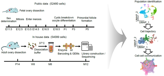 研究人员利用公共数据,收集了采用10xGenomics技术测序的来源于同一品系小鼠(C57BL/6)的单细胞RNA测序数据(从E11.5至P5)。此外,他们还对P14(出生后14天)、W8(8周)、M8(8月)和M12(12月)的小鼠卵巢进行了相同技术的测序,从而补全了小鼠从E11.5原始生殖细胞迁移至生殖嵴开始,直至12个月时卵泡闭锁和生殖储备耗尽的整个卵巢衰老过程。通过分析这一完整的卵巢发育周期,研究者对生殖细胞和体细胞进行了高精度的分类,并分别探究了这些细胞的分化发育轨迹、各阶段的功能以及关键基因。这项研究不仅为理解卵巢发育提供了重要的实验数据,还进一步加深了对卵巢体细胞,尤其是间充质细胞在卵巢发育和衰老中发挥功能的理解。