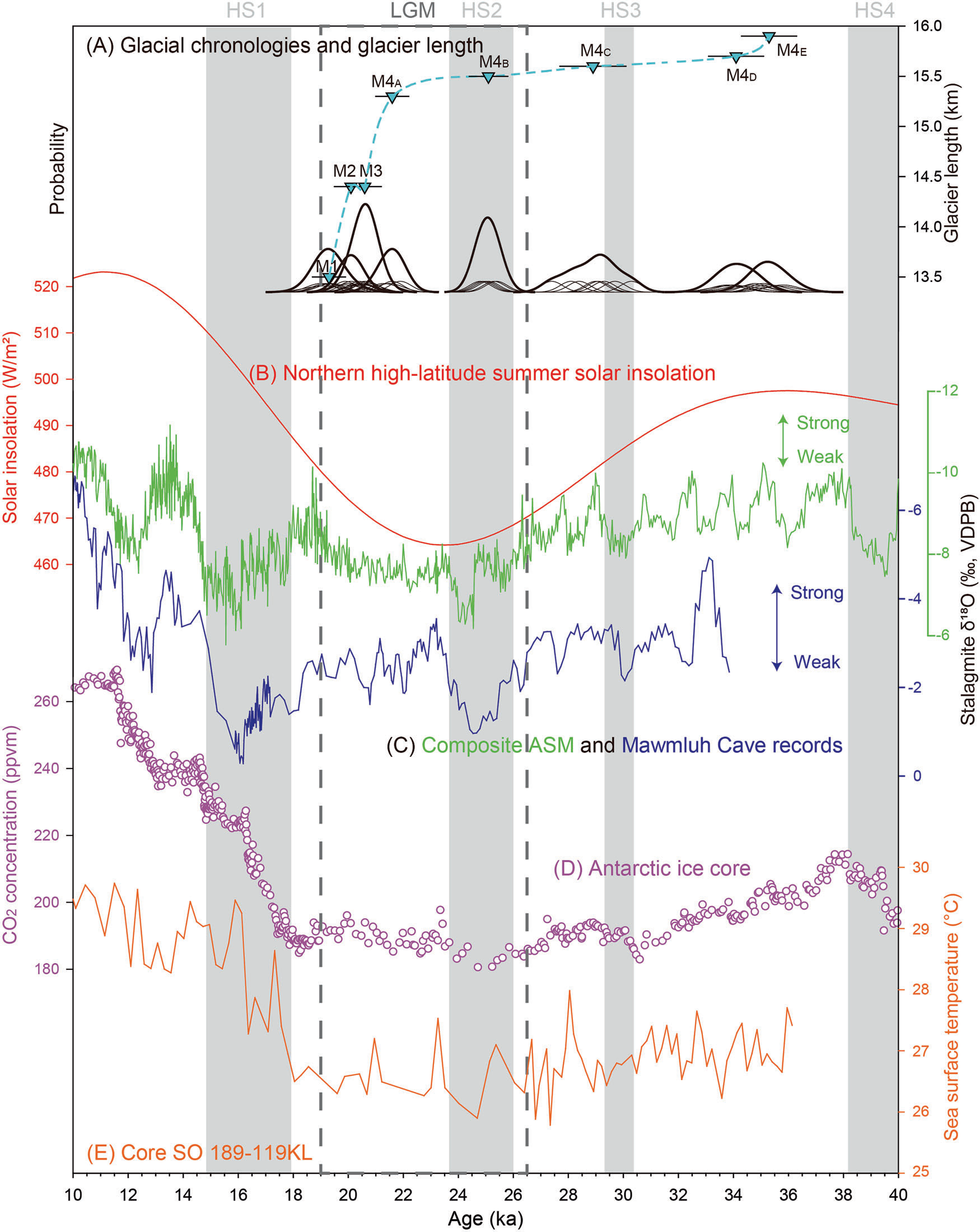 斯布曲末次冰期千年尺度冰川变化(A)与北半球高纬夏季太阳辐射(B)和气候记录(C-E)对比。地球环境所供图