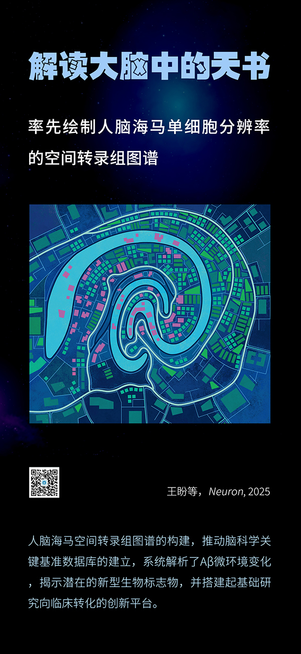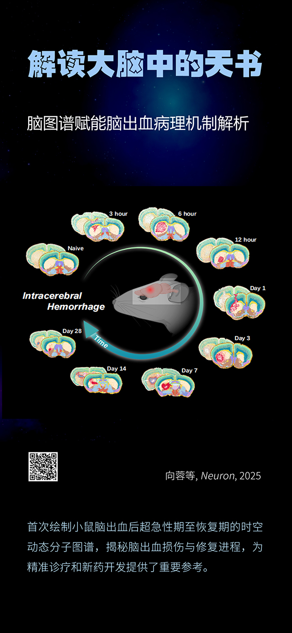 3、脑图谱赋能脑疾病机制解析。研究人员利用Stereo-Seq空间转录组技术,首次绘制正常人及阿尔茨海默病(AD)患者海马的单细胞分辨率空间转录图谱,发现了病理性小型胶质细胞和星形胶质细胞在海马伞区域的高度富集及细胞通讯增强,解析了Aβ微环境分子变化,为AD病理研究提供了更精细、系统的分子机制解析,并为AD的早期诊断提供了新的可能性;首次绘制小鼠脑出血后超急性期至恢复期的时空动态分子图谱,揭秘脑出血损伤与修复进程,阐明了以胶质细胞为代表的多种细胞类型在组织损伤与修复过程中的关键作用,为新药开发和精准治疗提供了重要参考。