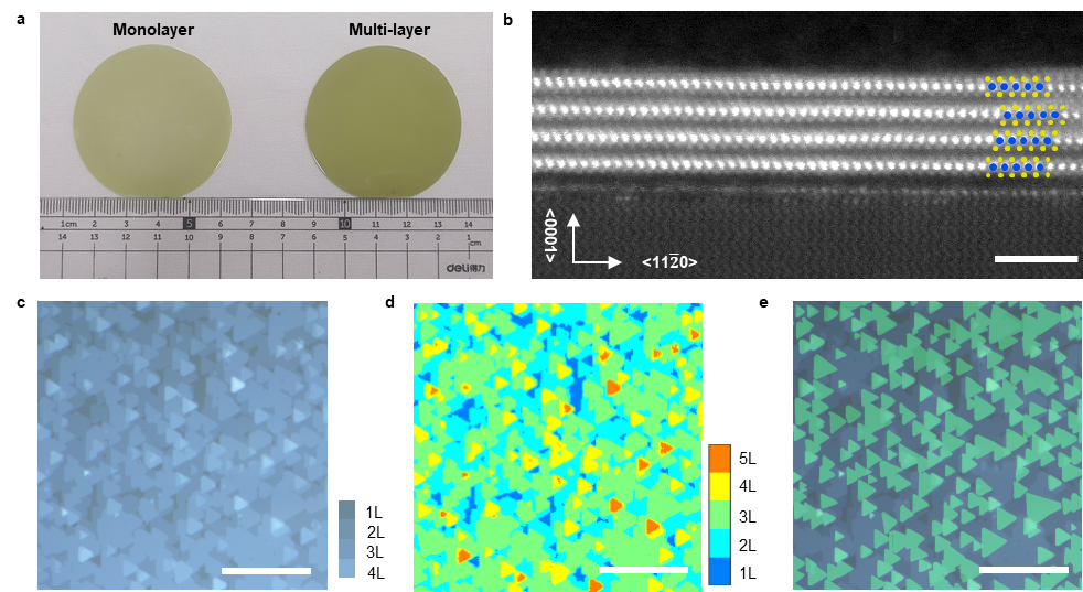 为攻克这一难题,研究团队使用同质外延策略。采用高质量单层单晶MoS2作为外延衬底,通过精准调控过渡金属前驱体浓度,成功实现了具有纯3R相的多层MoS2晶圆的制备(图1)。借助人工智能图像识别技术对堆垛结构进行自动化识别与统计分析,证实3R相所占比例接近100%。